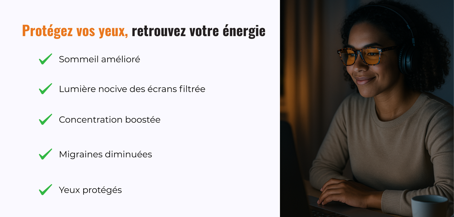 Les verres ambrés filtrent le spectre nocif de la lumière bleue émise par les écrans (ordinateur, smartphone, TV, tablette). Cela réduit la fatigue visuelle, améliore la qualité du sommeil et protège vos yeux à long terme.